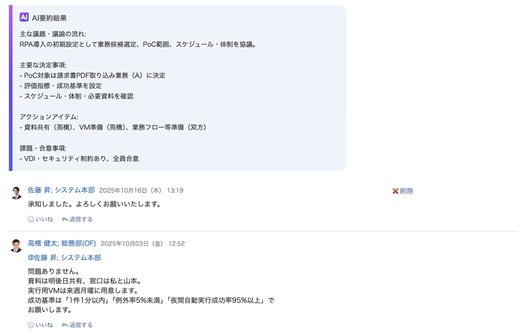 コメント全体を要約してくれるので、スケジュールでのやり取りを素早く把握できます。