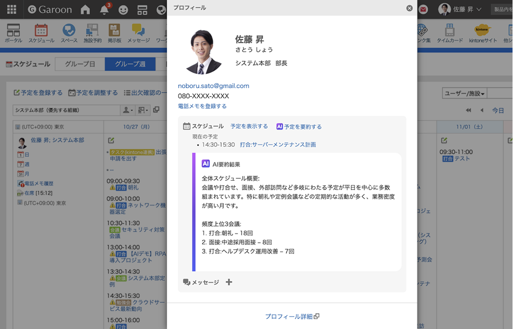 ユーザーごとのスケジュールをかんたんに要約してくれる機能です。今月の予定をまとめてくれるので、メンバーの業務状況の把握や、月報もかんたんに作成できます。
