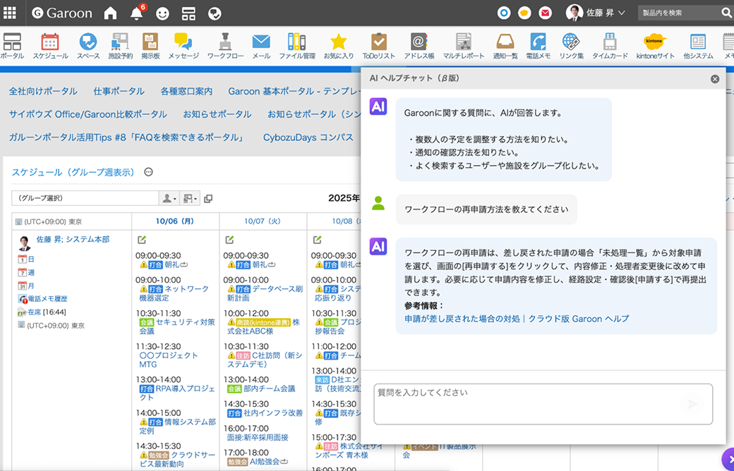Garoonの利用方法に関してチャットで簡単に質問できます。