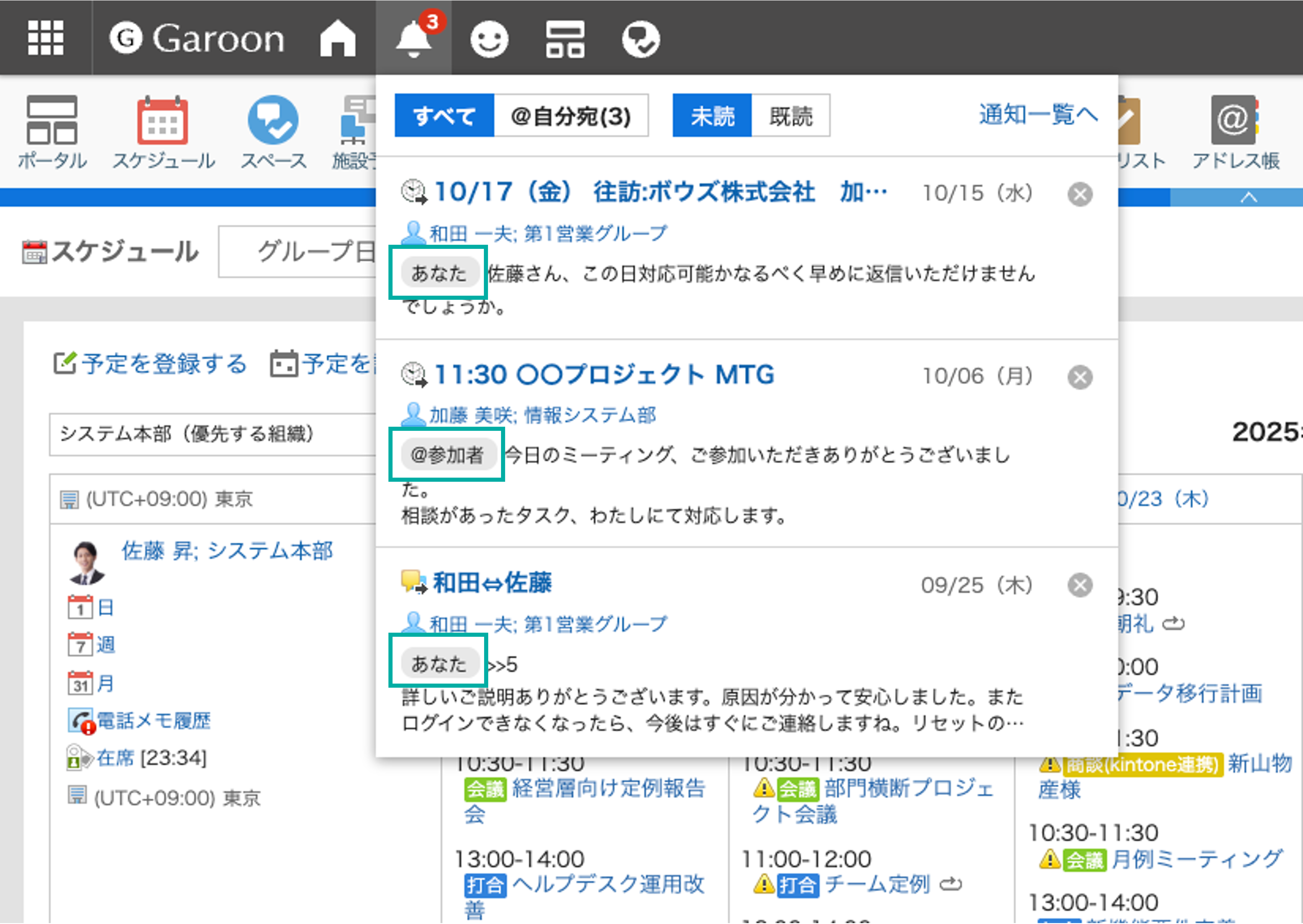 期日や予定調整、返答が必要な旨を表示してくれるので、急ぎで確認すべき通知に素早く気づくことができます。