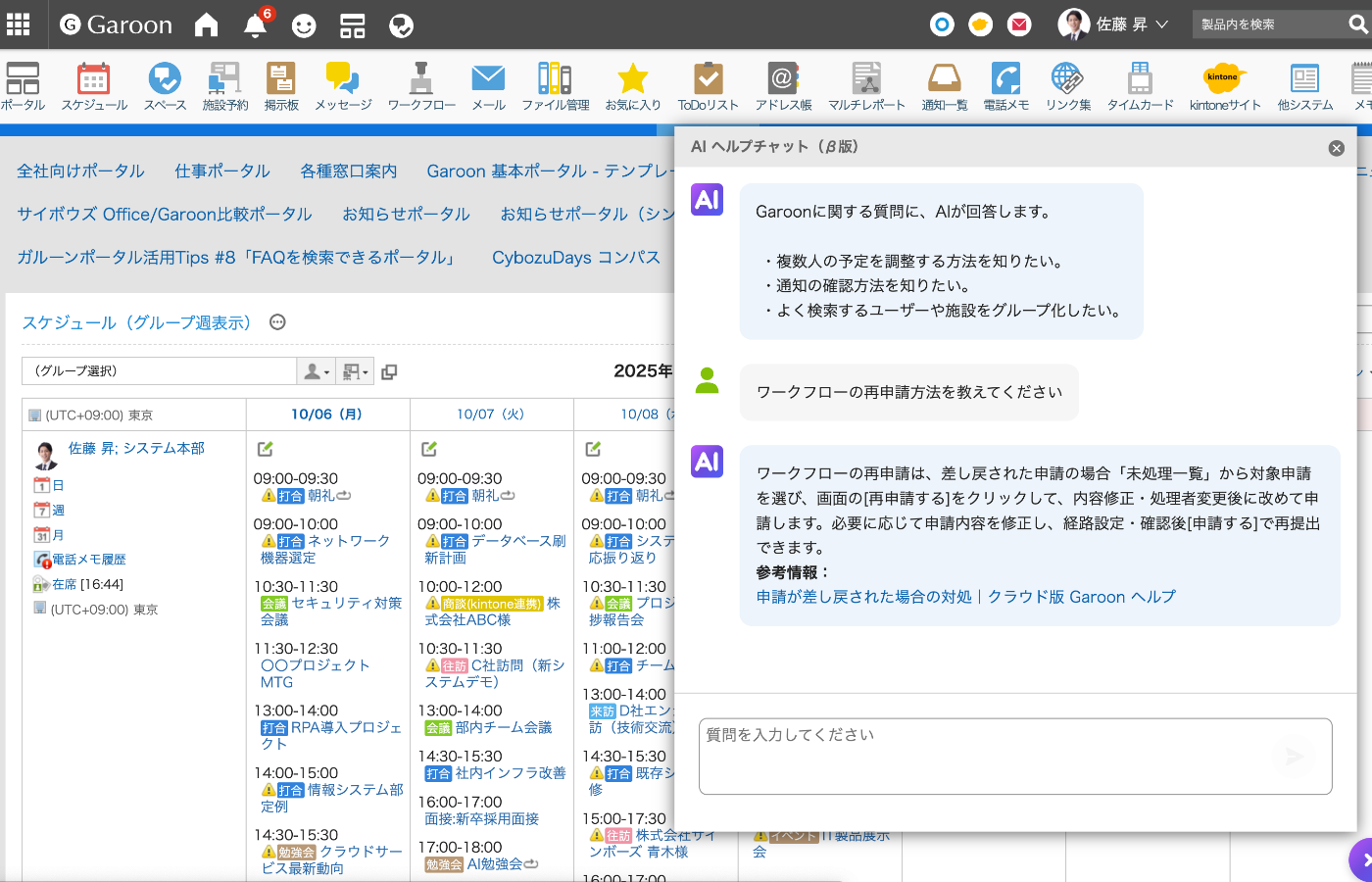Garoonの利用方法に関してチャット形式で簡単に質問できます。