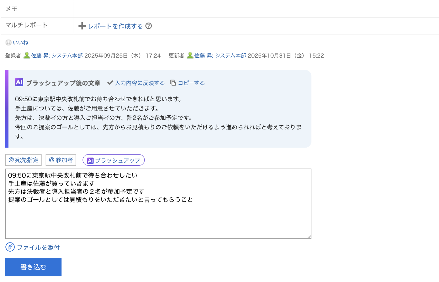 スケジュールのコメントで伝えたい内容をAIがわかりやすく校正してくれるように