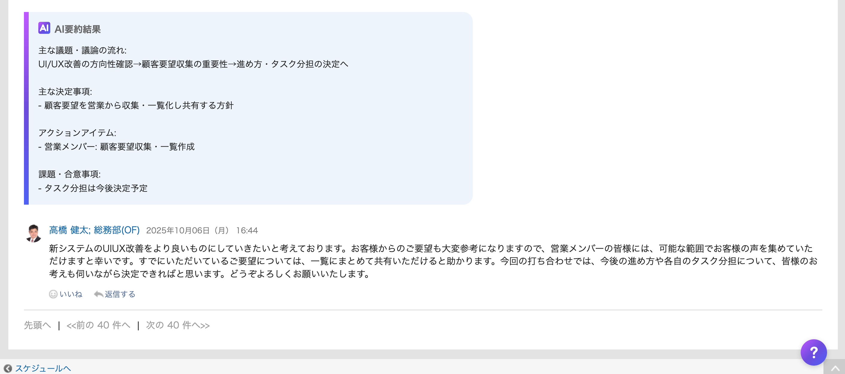 スケジュール上でやりとりしてきたコメントの履歴を要約してくれるので、スケジュールでのやり取りを素早く把握できます。